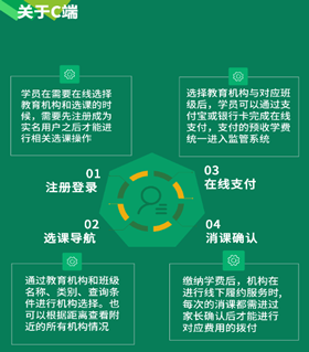 U培+:平臺是基于“民辦教育全場景綜合服務+資金監管”的互聯網+模式,通過“行政管理+金融監管”的結合,實現對民辦教育機構的辦學審批、師資建設、教學質量、服務質量、誠信監督、學費監管、異動預警等全生命周期管理。